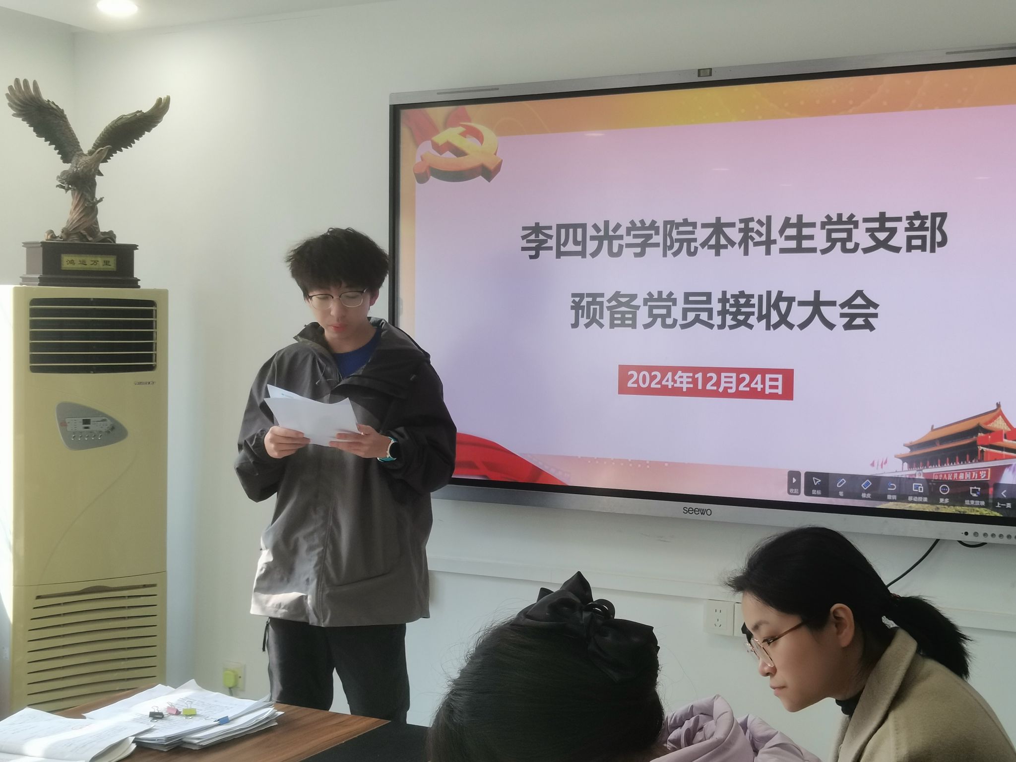 (通讯员 刘童)为了进一步壮大党的力量,加强党的组织建设,为党注入了新鲜血液,增添新活力,保持党的生机与活力,在党的光辉照耀下,2024年12月24日中午12:00,beat365英国官方网站本科生党支部于行政楼215成功开展了预备党员接收大会。参会人员有beat365英国官方网站本科生党支部全体党员。会议由beat365英国官方网站本科生党支部纪检委员付晨曦同志主持。