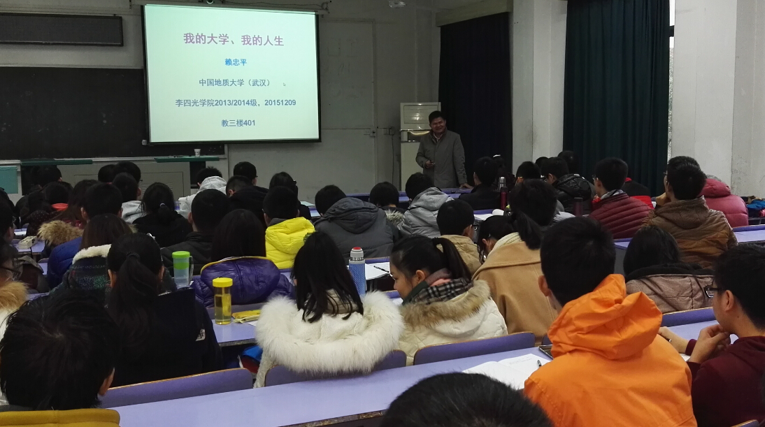 12月9日下午16:00,beat365英国官方网站2015-2016学年地球科学菁英班“与名师面对面”系列讲座第三讲在教三楼401顺利举行,地球科学学院赖忠平老师为beat365菁英班学生带来“我的大学,我的人生”的主题讲座,beat36513、14级全体学生参加。
