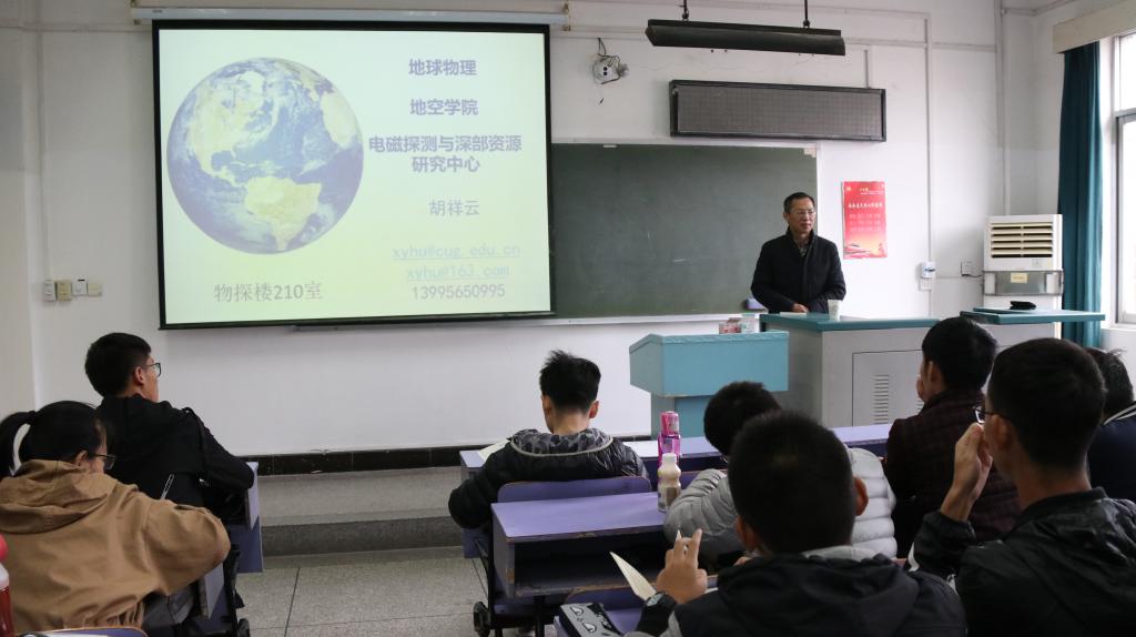 最后,胡老师向大家详细介绍了地球物理与空间信息学院以及自己所建设的电磁探测与深部资源研究中心,并与同学们热情的进行了互动交流,鼓励学生们尽快的培养兴趣,打好基础,能更快更好的投入到地球物理专业的学习和科研工作中,勇担历史使命!