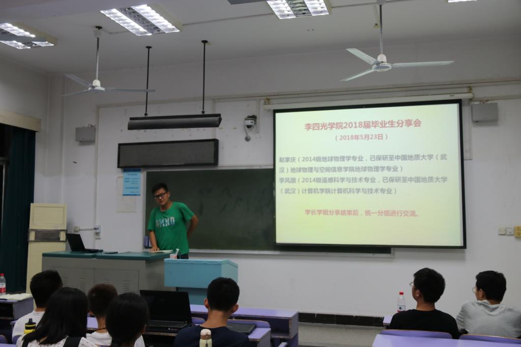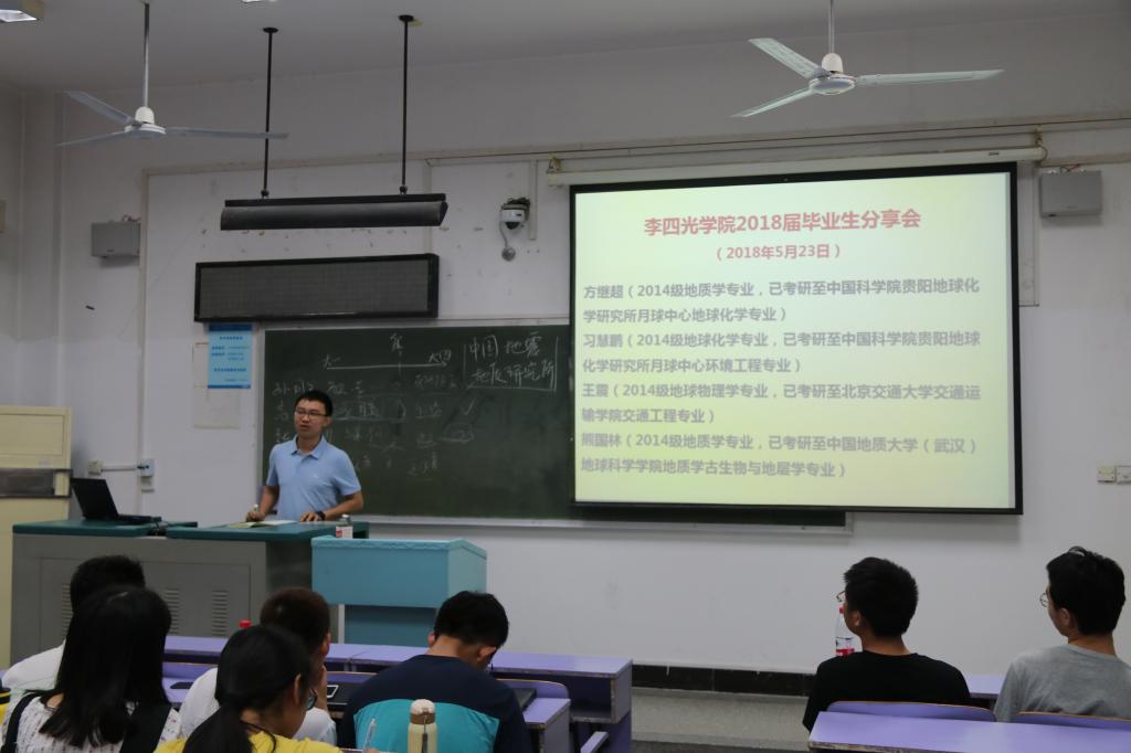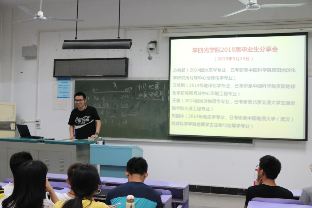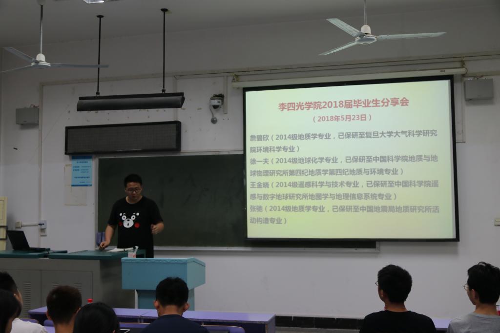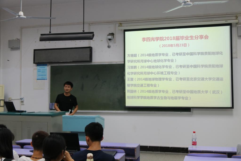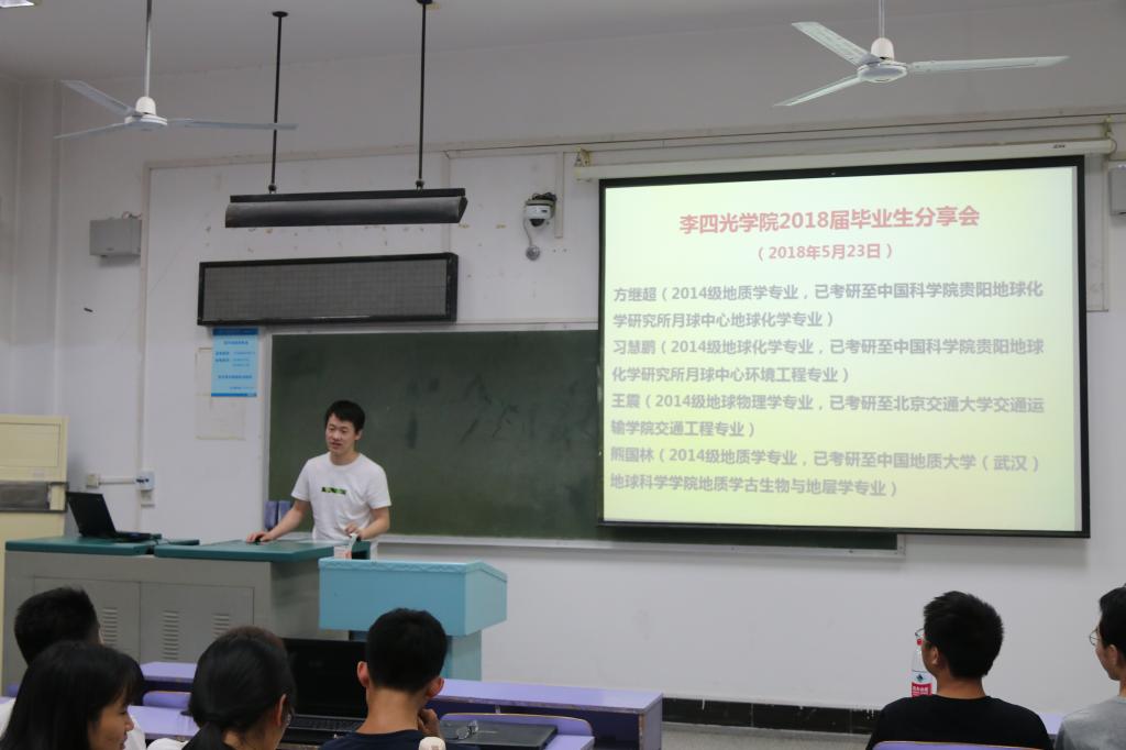 第五个进行分享的是考研至beat365英国官方网站(武汉)地球科学学院地质学专业的熊国林同学。他回味了自己大学四年的生活,由于大一时有一门挂科导致以后努力提高绩点的经历其实使自己丧失了生活中的一些乐趣。他肯定了英语的重要性,还指出强劲的编程能力会使人成为专业内的领先者。