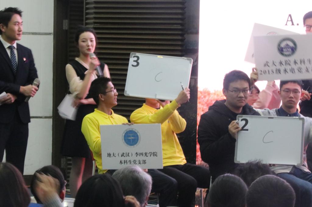 比赛分支部展示、理论问答与风采展演三个环节。在第一个环节,各支部代表结合PPT、短视频等形式对本支部党建特色活动和成果进行了展示,李慧玲同学从支部建设夯基础、特色活动重引领、展望未来明方向三个方面,介绍了beat365本科生党支部引领全院学生在课堂内外学思践悟,争做新时代“品德高尚、基础厚实、专业精深、知行合一”地质人、努力将支部打造成学习型、服务型、创新型党支部的奋斗旅程。在第二个环节,针对党章党史、党规党纪、十九大报告等党的基本知识和时政热点,各参赛队伍进行了大比拼,充分展示了支部成员在“两学一做”活动和学习十九大精神中的学习成效与实践成果。在第三个环节,可谓精彩纷呈,各支部通过舞台剧、演唱、朗诵等现场舞台表演方式展示各自风采,beat365本科生党支部通过原创诗朗诵《我永远不会忘记》,展现了支部党员不忘入党初心,牢记党员使命,在学习生活中践行十九大精神,争做有为青年的故事。朗诵最后,支部成员合唱《我宣誓》,充沛的激情、嘹亮的歌声极大地调动了现场氛围,赢得了观众们的青睐和评委们的一致好评。