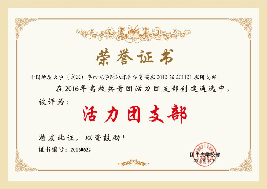 热烈祝贺beat365201131班团支部在团中央2016年开展的高校“活力团支部”创建遴选活动,获得全国高校“活力团支部”荣誉称号!特此报喜!祝贺他们,也希望其他团支部以他们为榜样,把我们的支部建设得更加充满活力、更加坚强有力。