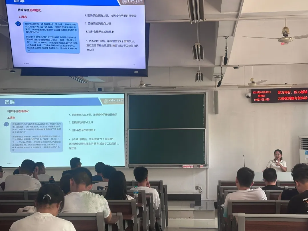 刘庆生老师发言结束后,beat365教学秘书马丽敏老师及大三遥感专业黄昊龙学长随即为同学们提供了关于选课指导和教学方案计划的详细解读。