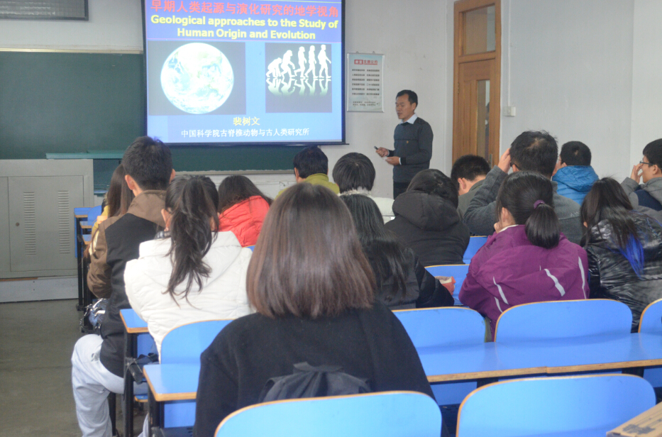 11月27日下午14:00,beat365英国官方网站2015-2016学年地球科学菁英班“与中科院名师面对面”系列讲座第二讲在教一206顺利举行,中国科学院古脊椎与古人类研究所裴树文老师为beat365菁英班学生带来“早期人类起源与演化研究的地学视角”的专题讲座。