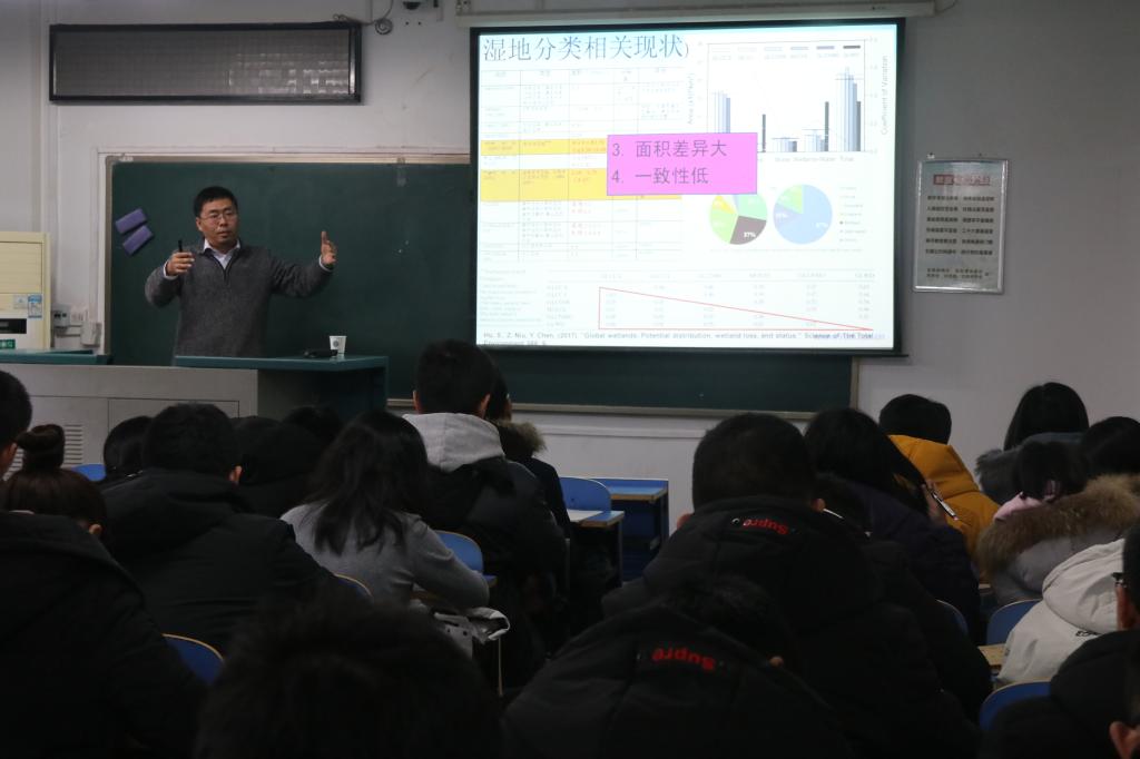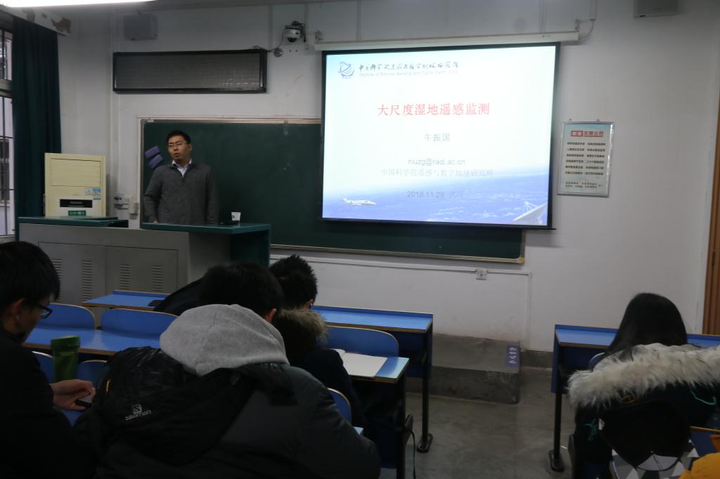 12月28日,beat365英国官方网站2018年地球科学导论课第八讲在教一楼203教室顺利开课,中科院遥感与数字地球研究所牛振国老师为beat36518级学生带来“大尺度湿地遥感进展”主题讲座。